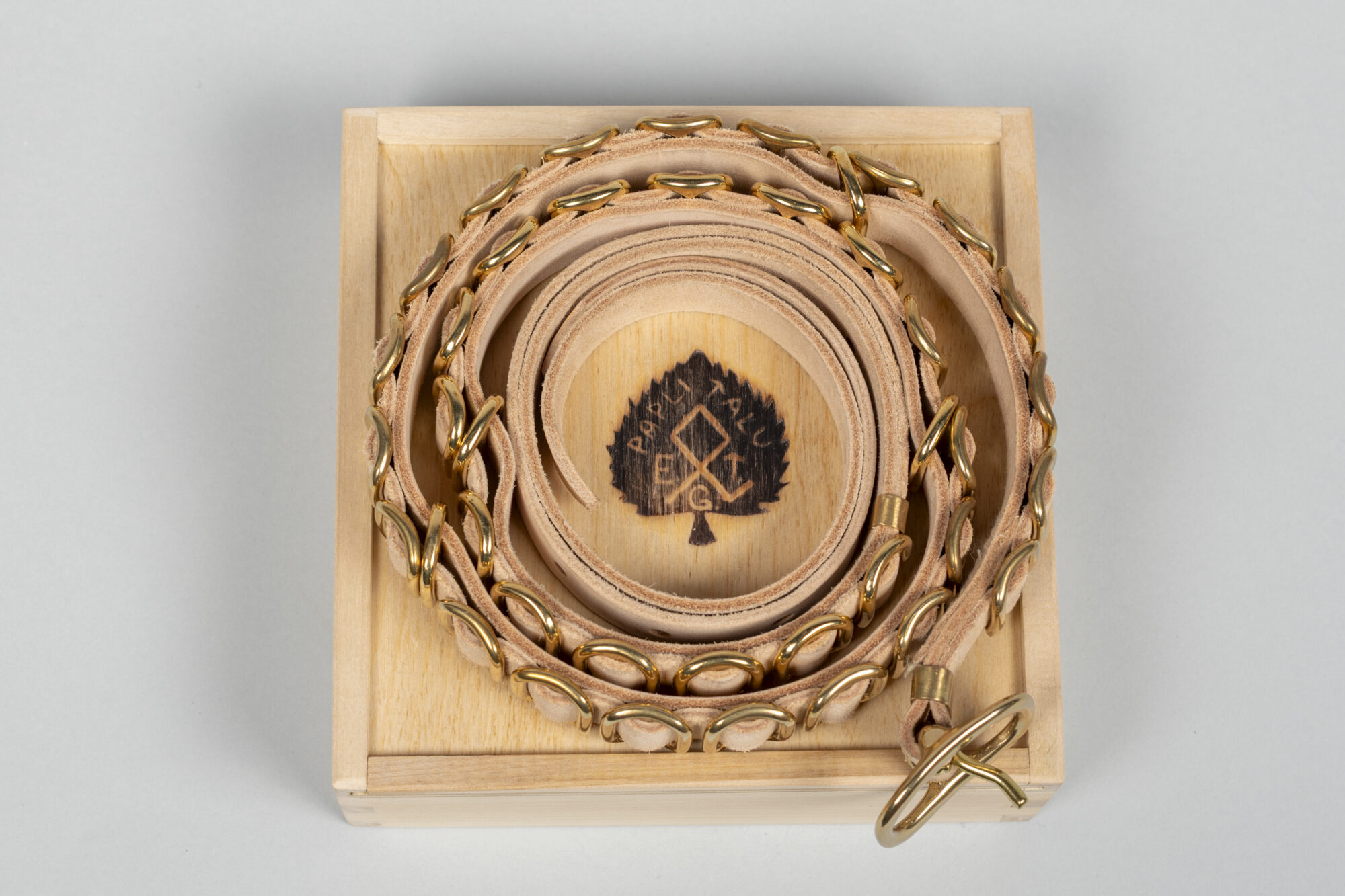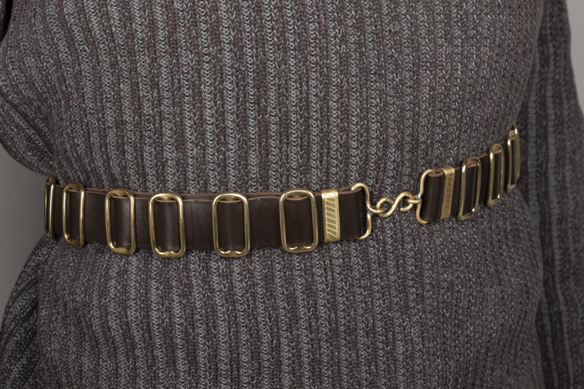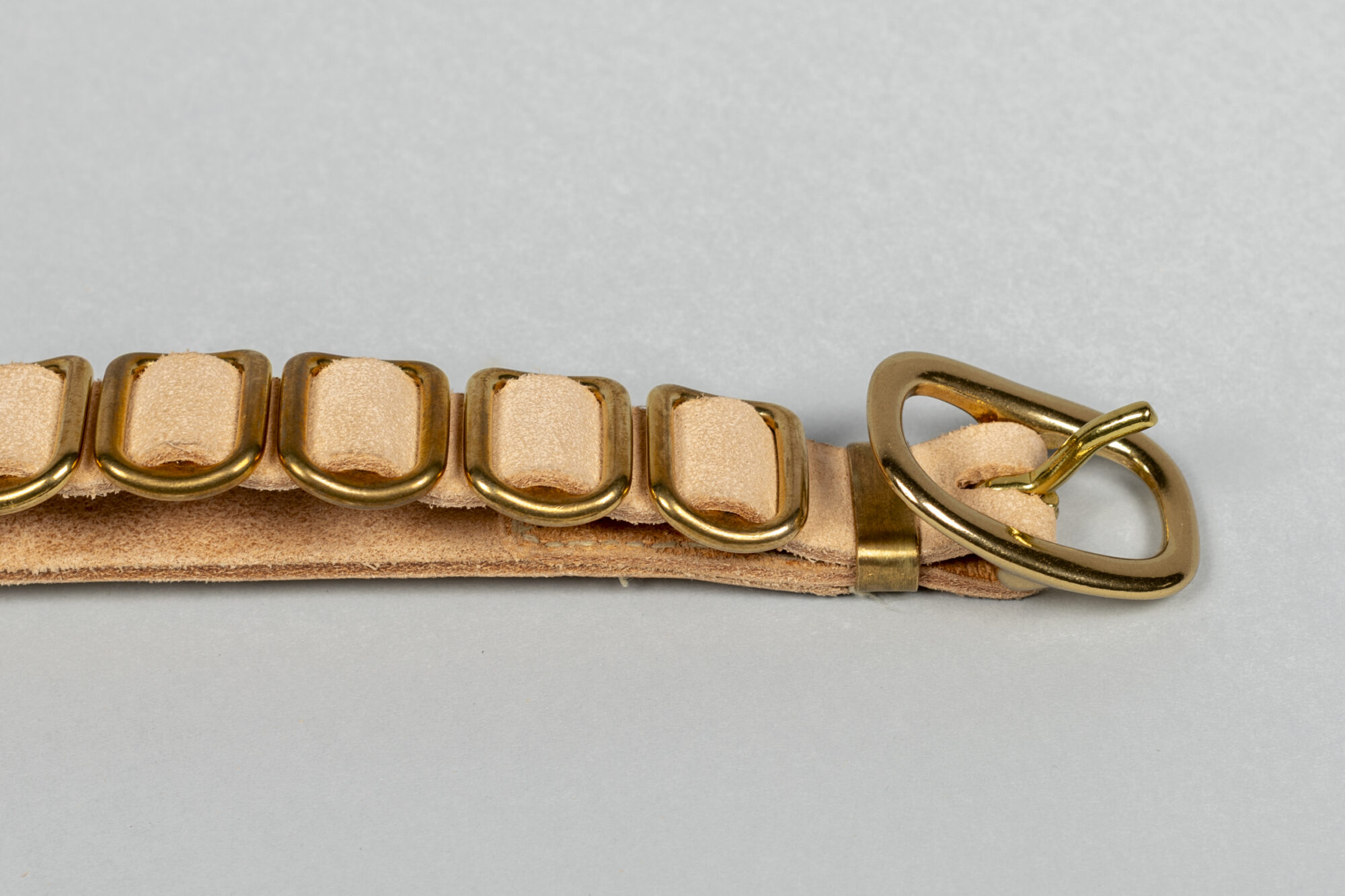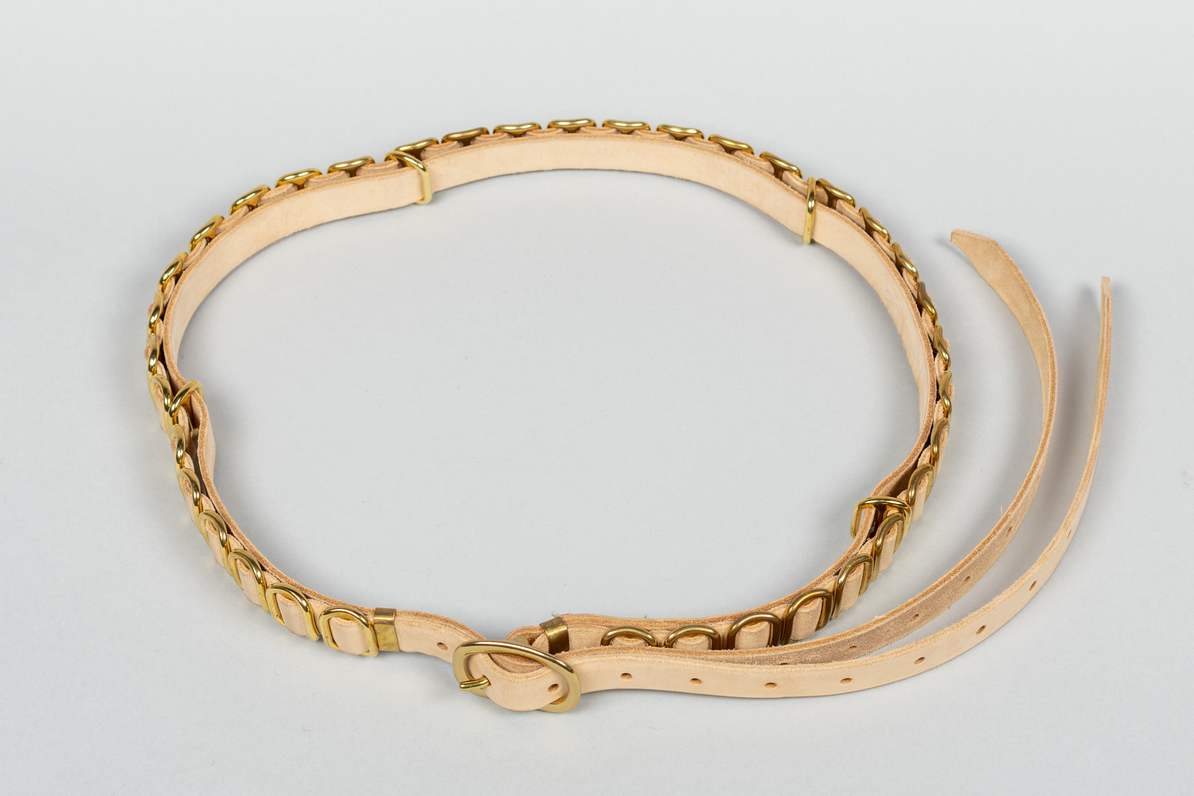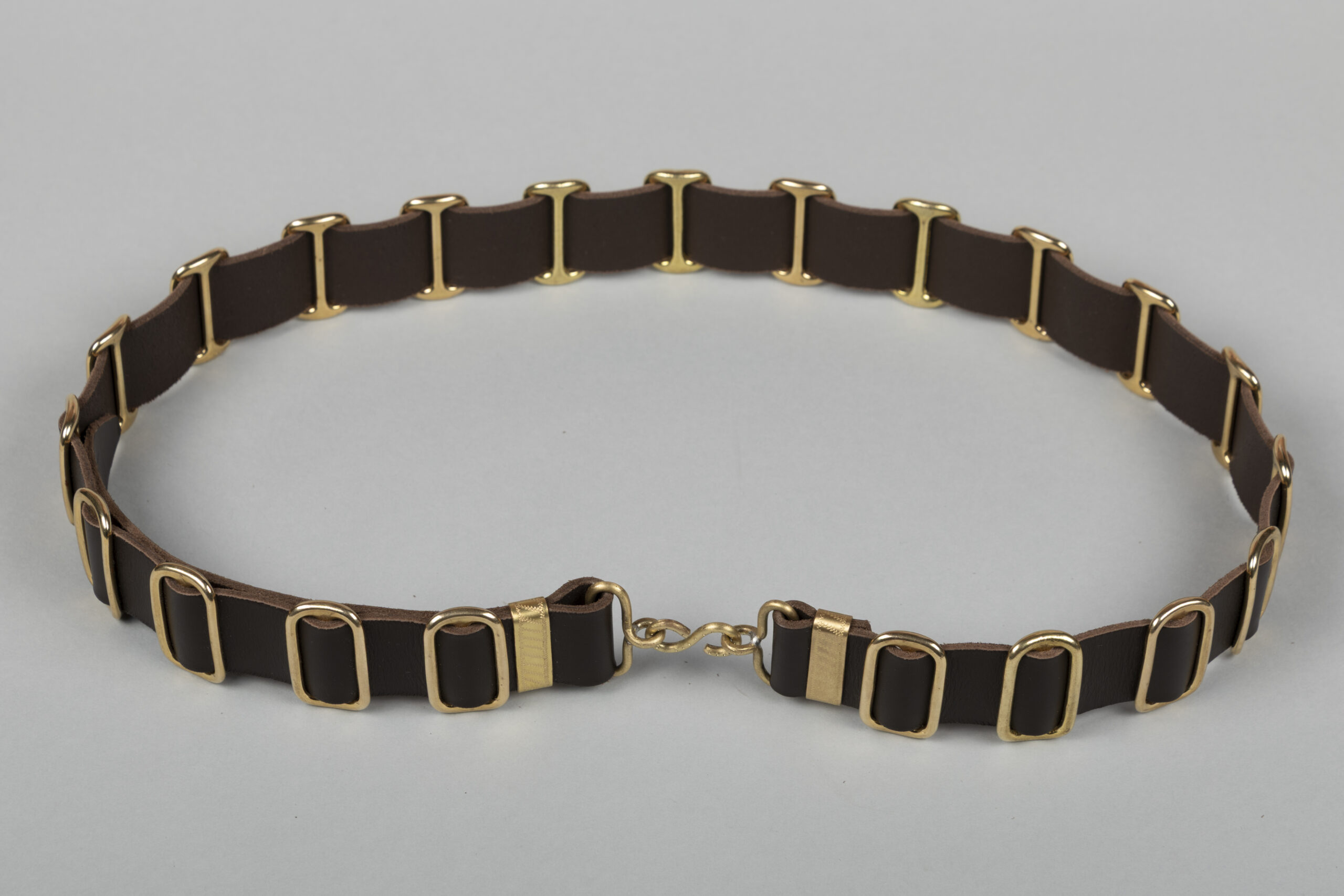 Nahk ja messing, laius 3,2cm, max pikkus ca 110 cm, reguleeritav. Pandla eeskuju: HKM 6295:11 Trr5:35