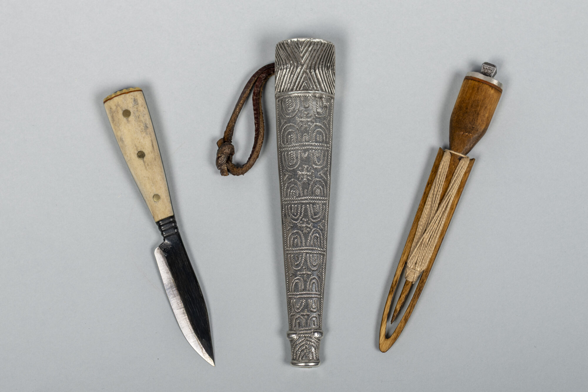 Valik värkstoas valminud traditsioonilisi Hiiu naiste tinatupega nugasid